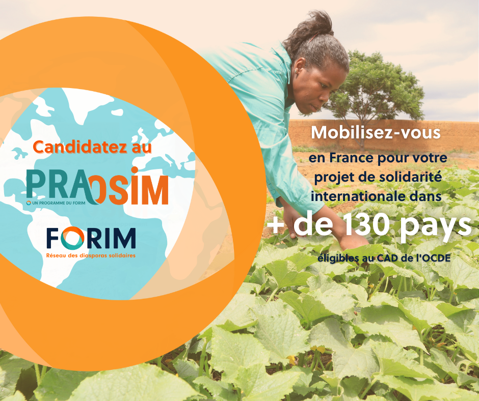 Chaque année, le FORIM lance l’appel à projets PRA/OSIM pour financer jusqu’à 15 000 € et accompagner les projets de solidarité internationale portés par les diasporas engagées au développement social et économique de leur pays d’origine. Depuis 2003, plus de 700 projets ont été financés dans plus de 38 pays en Afrique, aux Caraïbes, en Asie, en Europe,  et en Amérique Latine éligibles dans le CAD de l’OCDE
