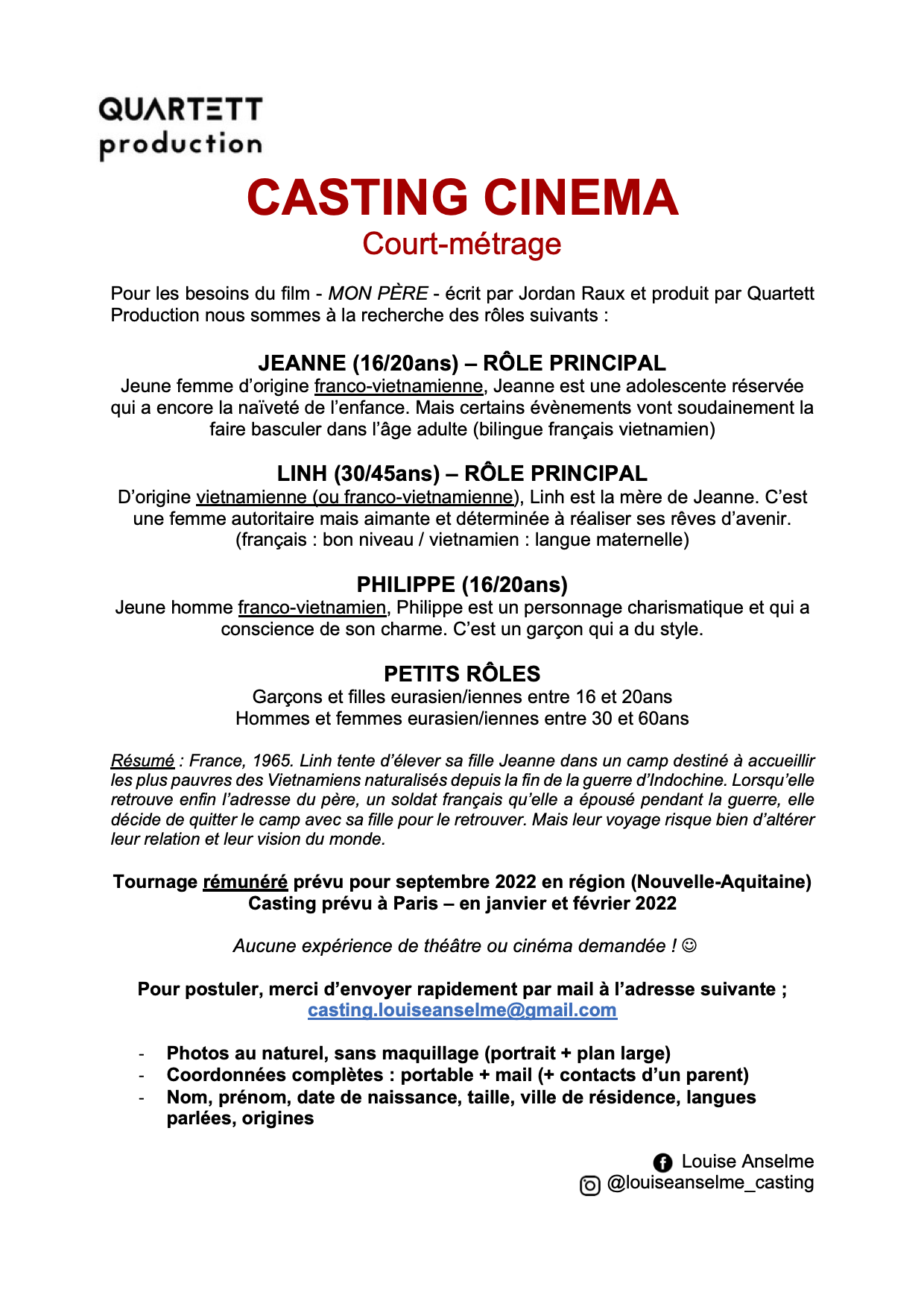 Pour le court-métrage intitulé "Mon Père", écrit par Jordan Raux et produit par Quartett Production, pour lequel nous sommes à la recherche de plusieurs femmes d'origines vietnamiennes ou franco-vietnamiennes. Ce projet est un travail de mémoire