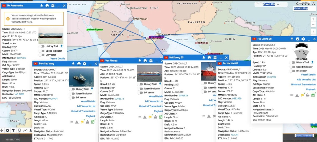 L'Administration maritime du Vietnam a annoncé qu'au 3 mars 2026, elle avait reçu des informations selon lesquelles huit navires avec 160 membres d'équipage vietnamiens sont présents dans la région du Moyen-Orient. Selon la liste, les navires