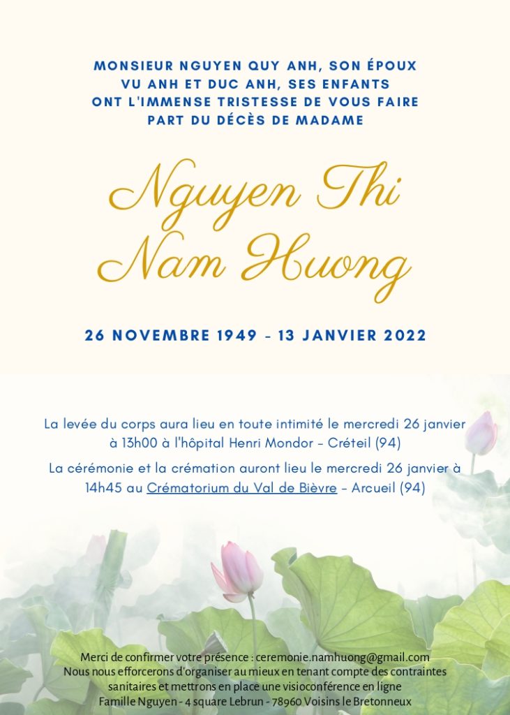 Faire-part de décès de Mme Nguyễn Thị Nam Hương (1949-2022)