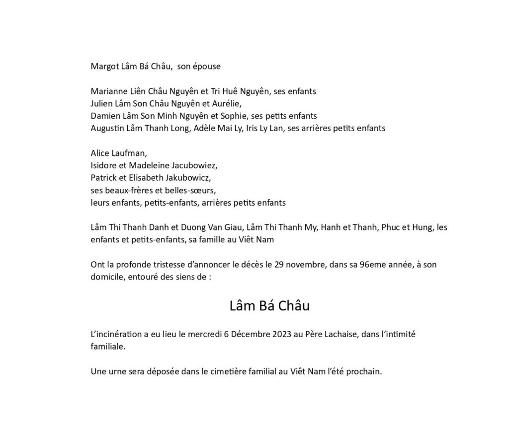 L’Union Générale des Vietnamiens de France est profondément émue et infiniment triste, de porter à votre connaissance le décès de Monsieur Lâm Bá Châu.