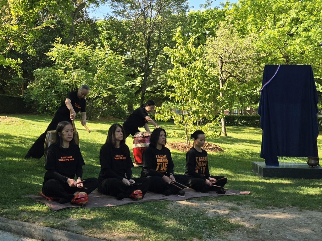 Le programme de la cérémonie a débuté par une prestation de tambours traditionnels vietnamiens par le groupe artistique des Sông Viet de l’UGVF, créant une atmosphère solennelle et profondément culturelle. Ont suivi les discours des représentants de la mairie, des organisations et des personnes impliquées dans le projet. Mme Trần Tố Nga a prononcé un discours très émouvant, avant la cérémonie d’offrande d’encens et une minute de silence dans un recueillement total. Le moment du dévoilement de la stèle et du dépôt de gerbes a marqué l’apogée de la cérémonie.