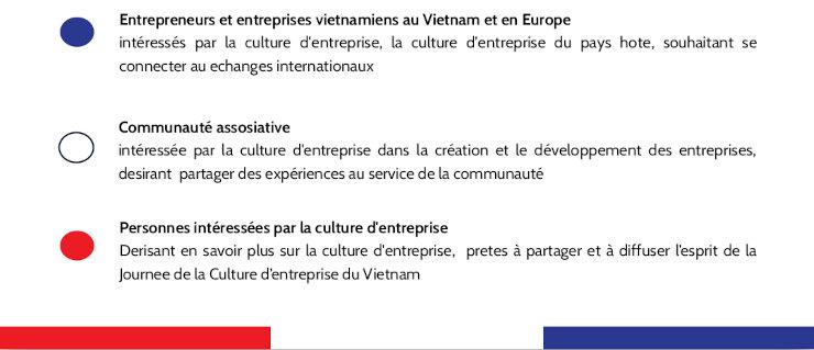 • Contribuer à mettre en réseau les entrepreneurs et les entreprises vietnamiens en Europe et en France, à les connecter avec le Pays via la culture d’entreprise et à connecter les entreprises nationales investissant à l’étranger avec la communauté d’affaires et les Vietnamiens en France et en Europe.