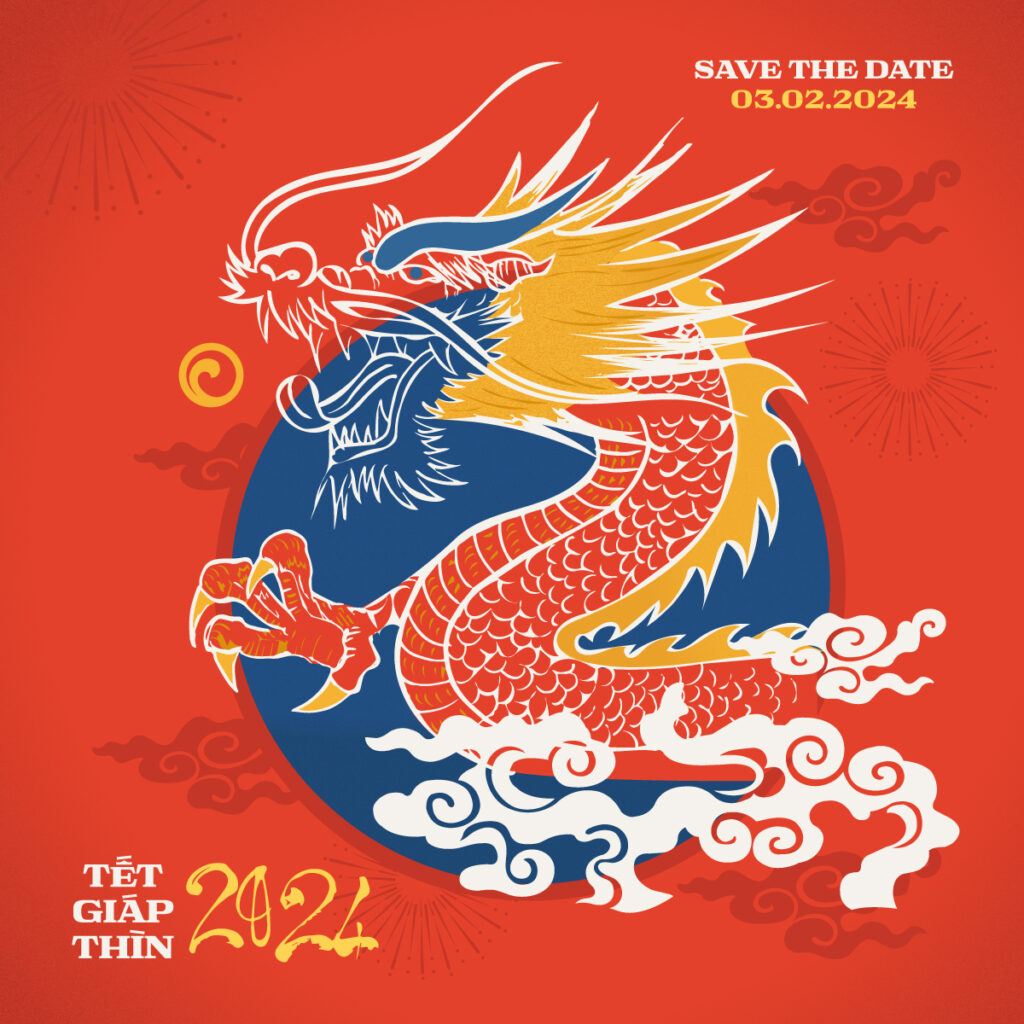 Trang : Pour correspondre au Tết traditionnel, j’ai choisi des couleurs folkloriques. Ce sont des couleurs « de base » telles que le rouge, le jaune et le bleu ciel. Ce sont des couleurs couramment utilisées dans les peintures folkloriques de Đông Hồ ou de Hàng Trống. L’image du dragon en rouge et jaune, symbole de puissance et de sacralité d’une créature légendaire, est placée sur un cercle bleu ciel, symbolisant la terre. Le fond rouge, une couleur souvent choisie pour le Tết, crée une atmosphère joyeuse et excitante pour les premiers jours du printemps. En outre, les images de nuages blancs que j’ai ajoutées sont également inspirées des peintures folkloriques de Hàng Trống, ce qui donne au logo une apparence moderne et traditionnelle, avec des couleurs folkloriques, conforme à l’esprit du Tết traditionnel vietnamien et de la culture vietnamienne en général.