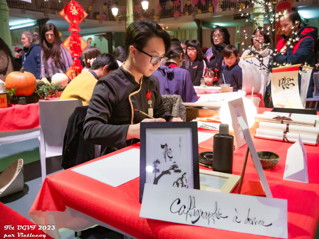 Đăng : Je continuerai à être actif dans le domaine de la musique, et bien sûr, la calligraphie reste ma passion, donc je consacrerai du temps à la calligraphie lors d’événements, en particulier ceux de l’UGVF. Prochainement, pour le Tết de l’UGVF, je serai le « Monsieur Đồ » qui calligraphie des vœux du Nouvel An en utilisant la peinture à l’encre au marché du Têt le samedi 3 février.