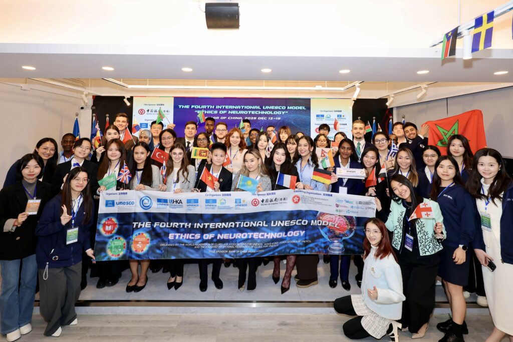 Du 13 au 16 décembre 2025, la 4e Conférence internationale modèle de l’UNESCO – The 4th International UNESCO Model on the Ethics of Neurotechnology – s’est tenue pour la première fois à Hong Kong, réunissant 45 jeunes délégués, dont 30 délégués internationaux issus de 25 pays et 15 étudiants des universités de Hong Kong. L’événement a été organisé par la Fédération mondiale des Clubs et Associations pour l’UNESCO (WFUCA) en coopération avec l’Association UNESCO de Hong Kong (UHKA), sous le patronage de l’UNESCO et avec le parrainage principal de la Bank of China (Hong Kong).