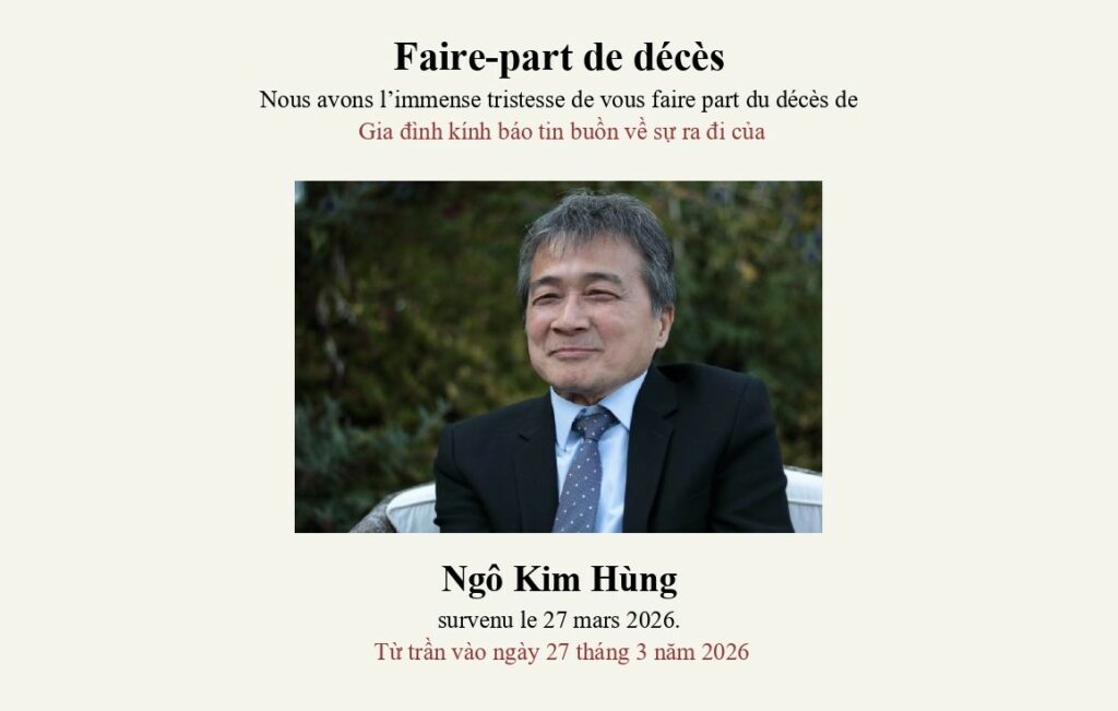 L’Union générale des Vietnamiens de France (UGVF) est profondément émue et infiniment attristée d’annoncer le décès de Monsieur Ngô Kim Hùng, survenu le 27 mars 2026 à son domicile (Le Kremlin-Bicêtre), à l’âge de 76 ans.