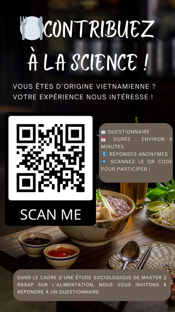 Home / Page d'accueil  / Actualités générales  / Participer à une étude sur les représentations et pratiques alimentaires des Vietnamien(ne)s vivant en France