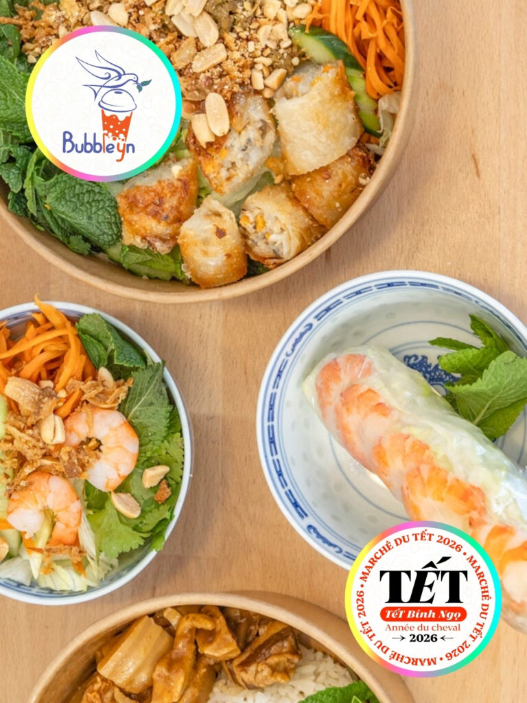 Au stand Bubble Yn : Banh Mi, Banh Cuon, soupe de raviolis crevettes, Bo Bun au bœuf, Nem Lao, Banh Khot crevettes-coco, accompagnés de bubble teas frais aux parfums gourmands.