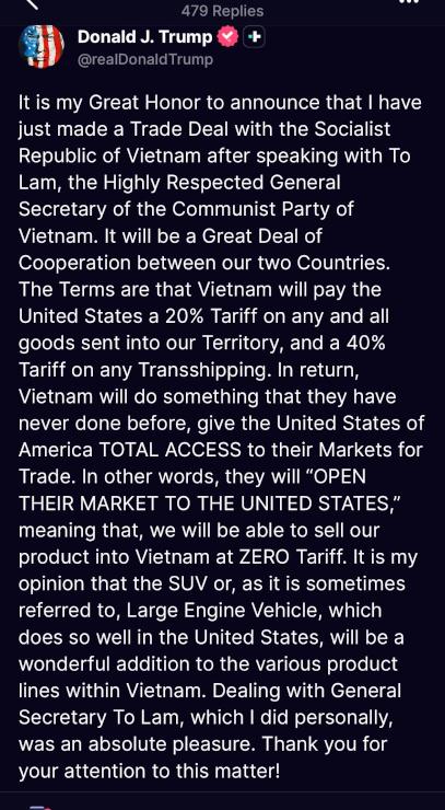 Dans un message publié sur son réseau social Truth, Donald Trump affirme avoir conclu un accord commercial avec le Vietnam après un échange direct avec To Lam, secrétaire général du Parti communiste vietnamien. Il détaille les termes d’un accord qui ouvrirait largement les marchés du Vietnam aux produits d’exportation américains.