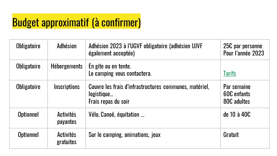 Son objectif est de rassembler les membres de l’UGVF et des associations amies lors d’une semaine de vacances dans l’esprit associatif.