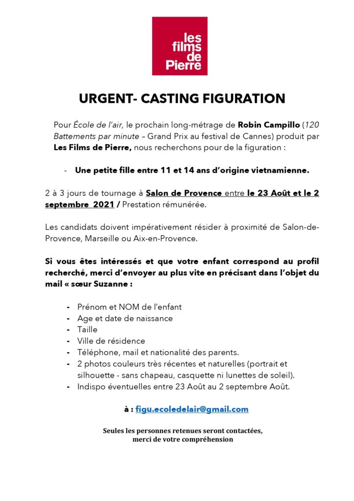 Grâce aux réseaux de l’UGVF, les Films de Pierre ont trouvé leur petite fille vietnamienne personnage principale de leur film « Ecole de l’air ». Ils sont maintenant à la recherche de sa grande soeur, une jeune fille d’origine vietnamienne entre 11 et 14 ans, qui fera juste quelques apparitions dans le film (rôle de figuration).Plusieurs jours de tournage sont prévus 23 aout du 02 septembre sur la base militaire de salon de-Provence.