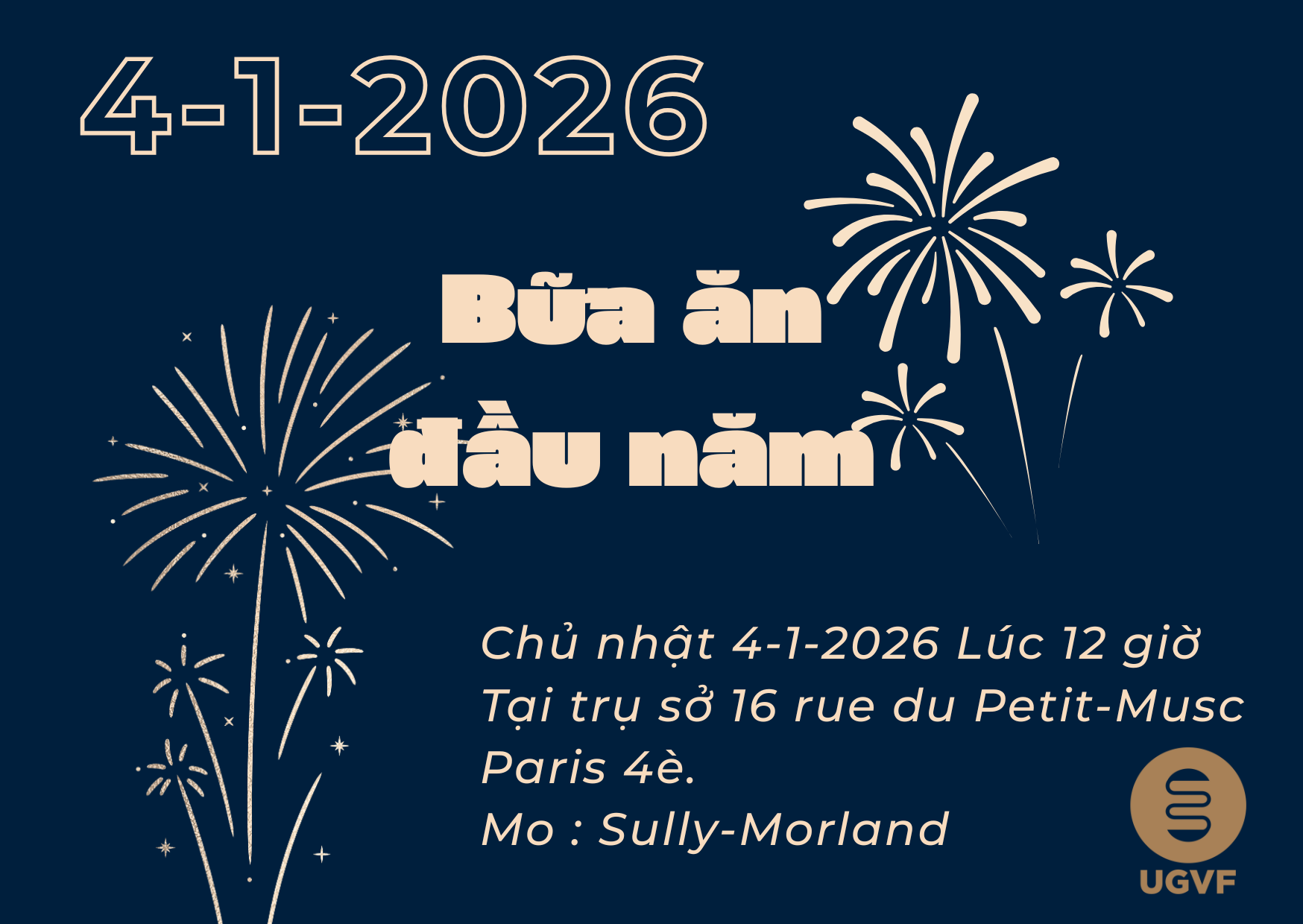 Bữa ăn đầu năm Chủ nhật 4-1-2026 Lúc 12 giờ Tại trụ sở 16 rue du Petit-Musc Paris 4è.