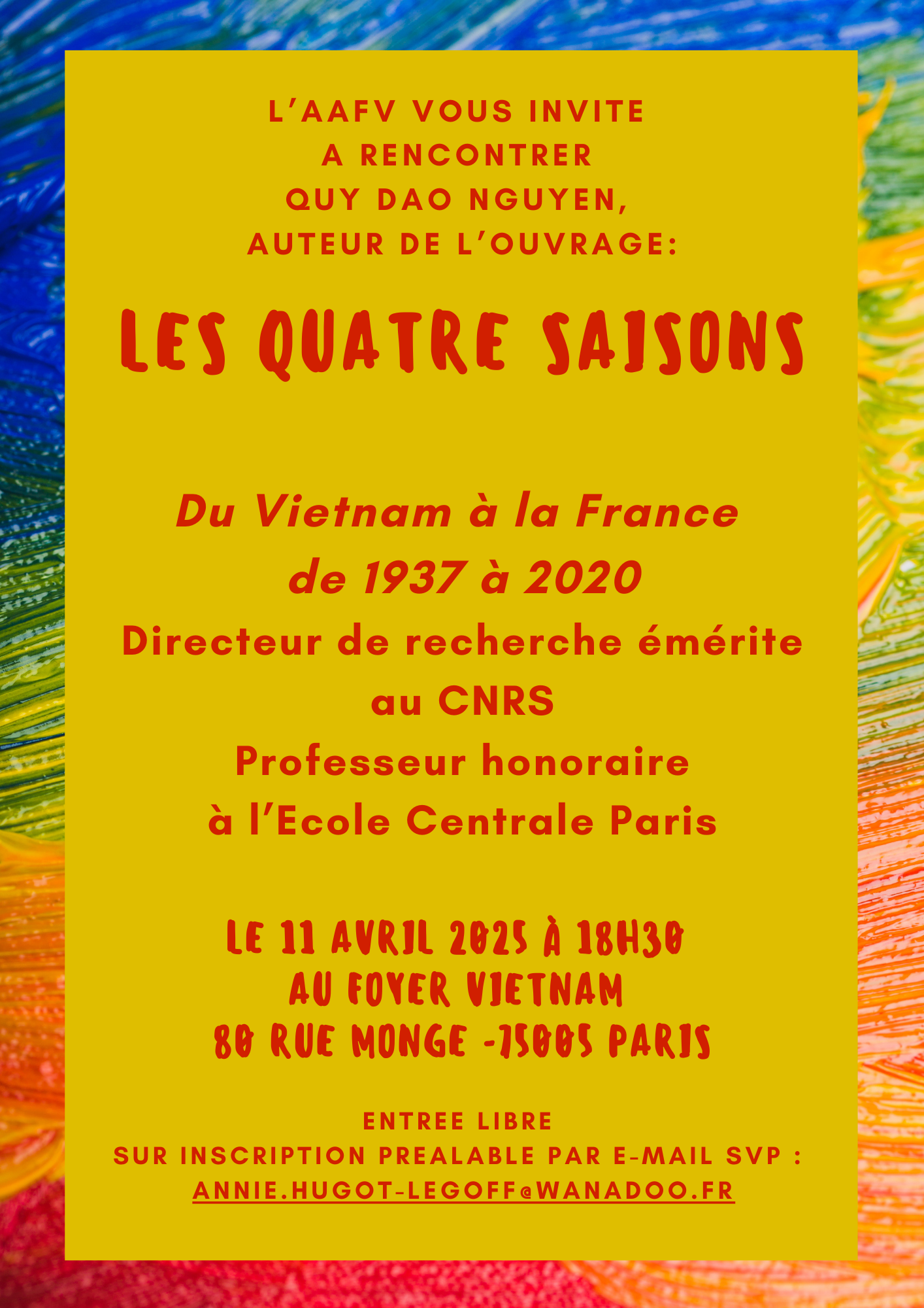 LES QUATRE SAISONSDu Vietnam à la France de 1937 à 2020AAFV trân trọng mời quý vị đến gặp gỡ ông Nguyễn Quý Đạo, tác giả