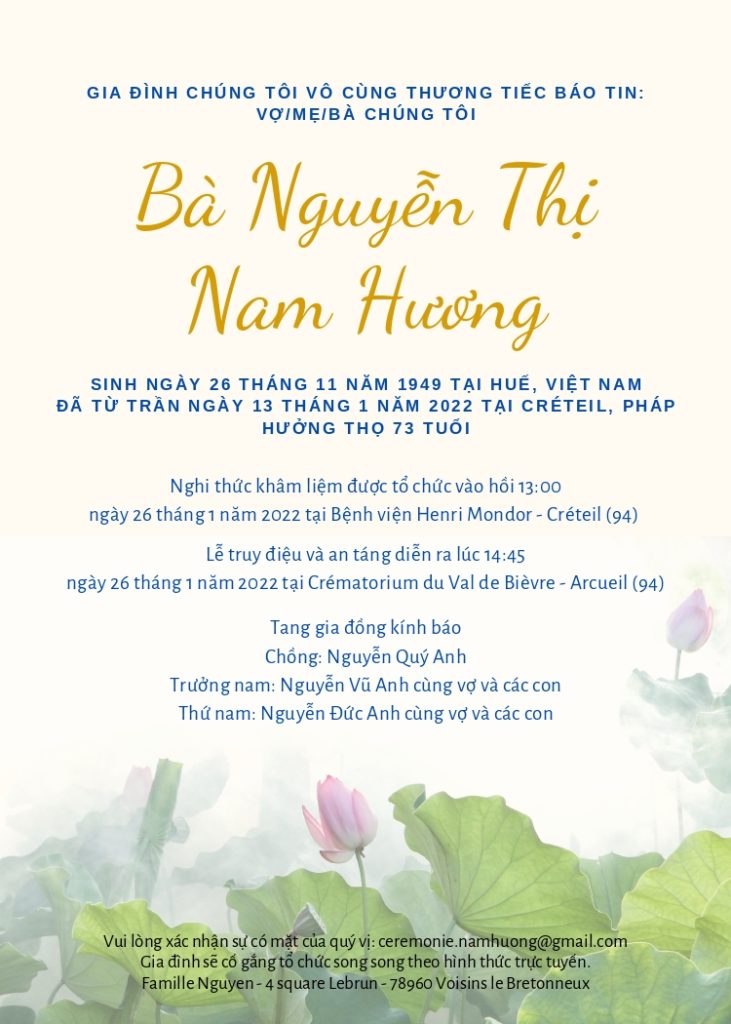 Bà Nguyễn Thị Nam Hương (1949-2022) Hội người Việt Nam tại Pháp xin thành thực chia buồn cùng anh Nguyễn Quý Anh và thân quyến. 19 Tháng 1 2022 13 h 35 min00 1001Views SHARE Hội người Việt Nam tại Pháp xin thành thực chia buồn cùng anh Nguyễn Quý Anh và thân quyến.