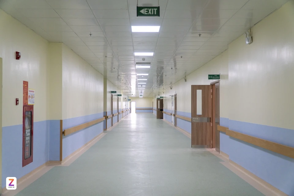 Hành lang khu khoa phòng chức năng với tay vịn dọc lối đi hỗ trợ bệnh nhân di chuyển thuận tiện, an toàn.