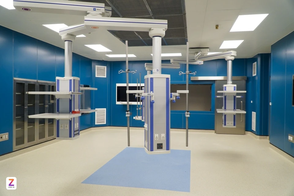Phòng mổ được trang bị hệ thống treo trần hiện đại cung cấp khí y tế, loại bỏ dây cáp dưới sàn và tối ưu không gian thao tác.