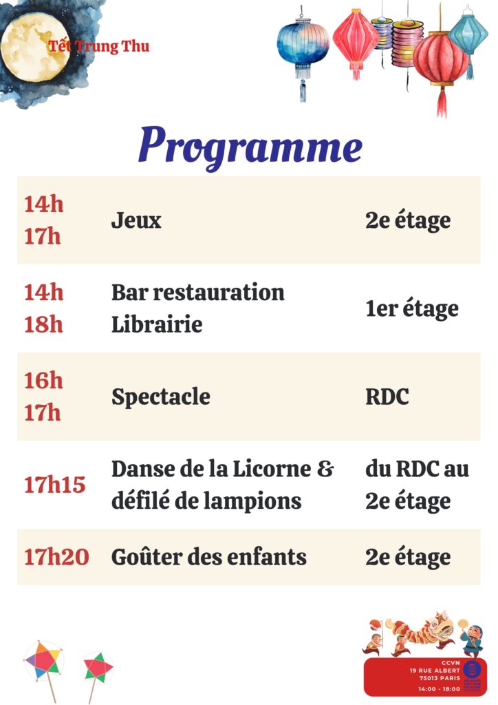 Các em học sinh từ các lớp « Về nguồn », « Cánh diều » và « Cô Claudine » sẽ lần lượt lên sân khấu biểu diễn các tiết mục hát tiếng Việt và múa chủ đề Trung Thu.