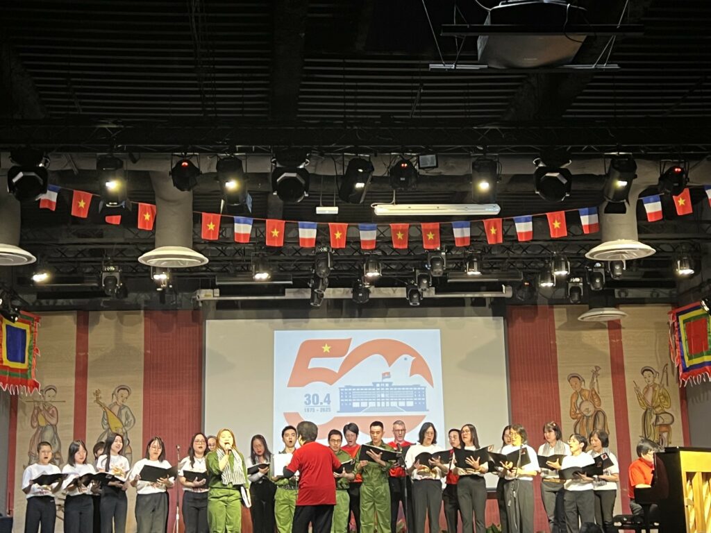Đặc biệt, các em thiếu nhi người Việt tại Pháp của lớp Về Nguồn thuộc hội UGVF trong trang phục dân tộc đã biểu diễn tiết mục hát múa sôi nổi, tay vẫy cờ hoa và ca vang những bài hát mừng giải phóng. Màn trình diễn đã gắn kết các thế hệ trong cộng đồng, thể hiện tinh thần hướng về cội nguồn của thế hệ trẻ sinh ra nơi đất khách.