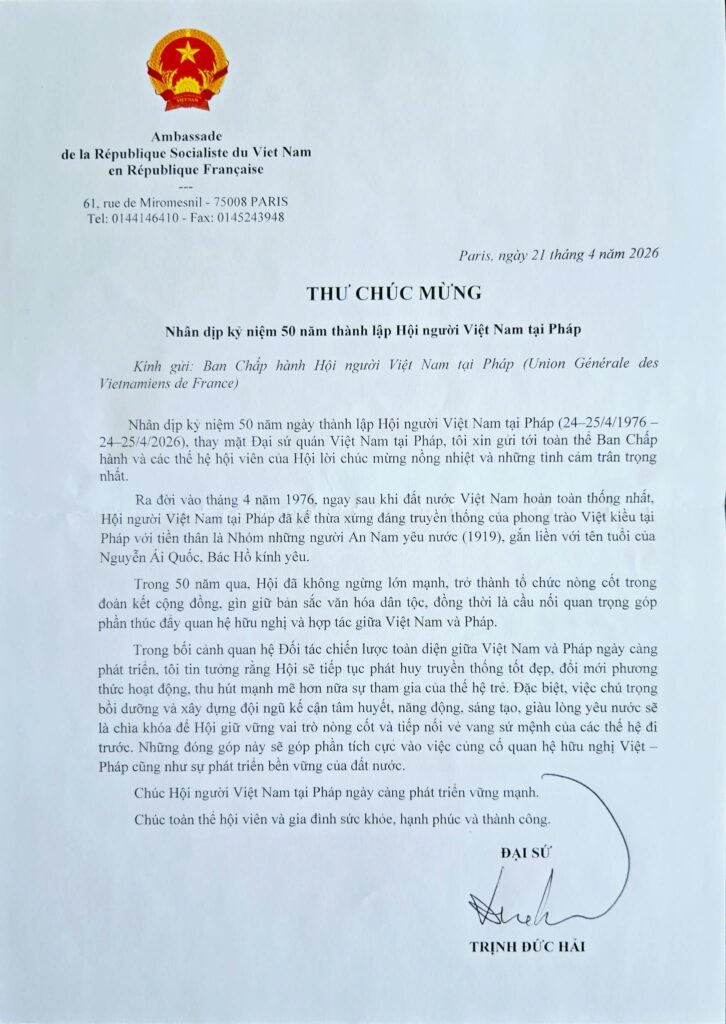 Nhân dịp kỷ niệm 50 năm thành lập Hội người Việt Nam tại Pháp (UGVF) (1976–2026), Đại sứ Việt Nam tại Cộng hòa Pháp, ông Trịnh Đức Hải, đã gửi thư chúc mừng tới toàn thể Ban Chấp hành và các thế hệ hội viên của Hội.