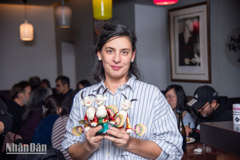 Chị Noémie Do Linh, người đấu giá thành công ba con rối gỗ hình chú Tễu. (Ảnh: MINH DUY)