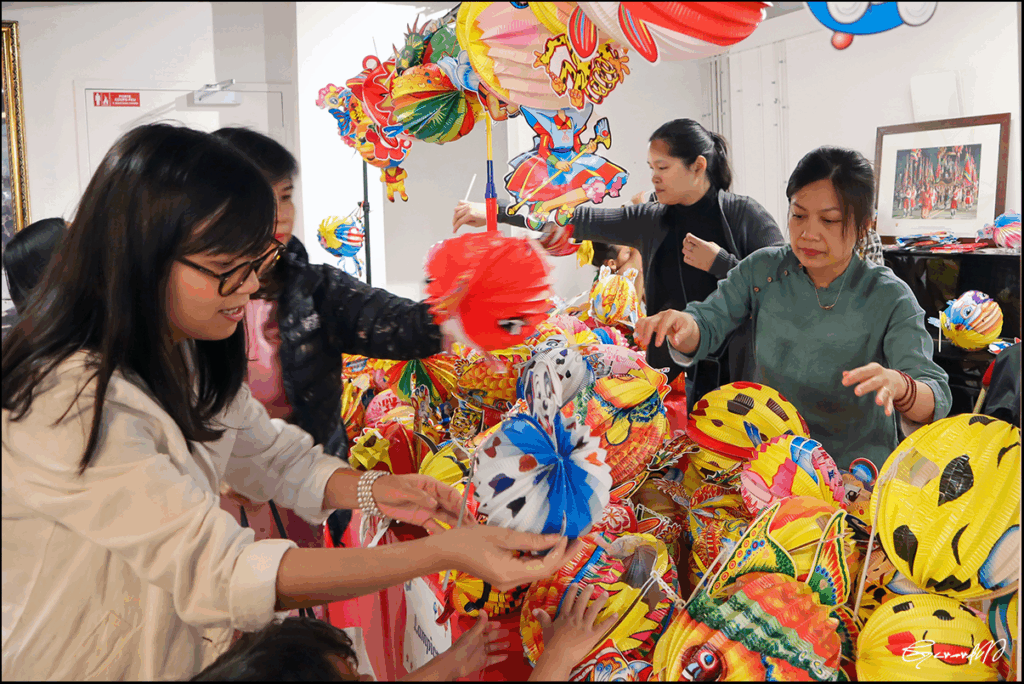 Những chiếc đèn ông sao, mặt nạ giấy bồi, đầu lân sặc sỡ được trưng bày khắp nơi, gợi lại ký ức tuổi thơ của nhiều người Việt xa xứ.