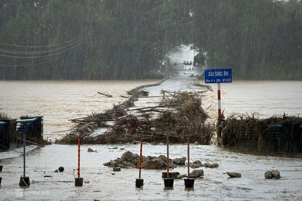 Chiều 27/10, cầu sông Rin (cũ) vẫn đang ngập sâu 0,7 m, nước sông đục ngầu do kéo theo dòng bùn đỏ phía thượng nguồn. Một số cầu khác trên sông Trà Khúc và sông Vệ như cầu Xi Phông (Hành Phước – Hành Thịnh), cầu máng Hành Minh – Hành Nhân, cầu tràn Thạch Nham… cũng đang ngập khoảng nửa mét, lực lượng chức năng đang chốt chặn, hướng dẫn phương tiện đổi hướng.
