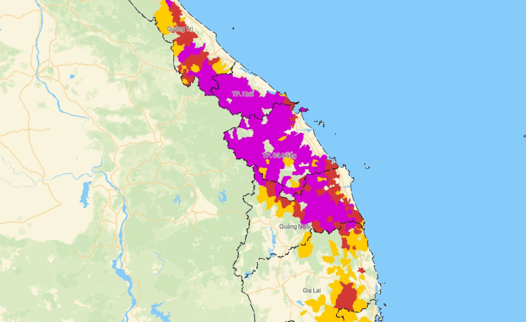 Các khu vực có nguy cơ sạt lở, trong đó màu tím là cảnh báo mức rất cao, màu đỏ là cao và màu vàng là trung bình.
