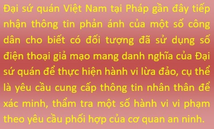 Tại Pháp, Đại sứ quán gần đây tiếp nhận nhiều thông tin phản ánh của công dân cho biết có đối tượng đã sử dụng số điện thoại giả mạo mang danh nghĩa của Đại sứ quán để thực hiện hành vi lừa đảo, cụ thể là yêu cầu cung cấp thông tin nhân thân để xác minh, thẩm tra một số hành vi vi phạm theo yêu cầu phối hợp của cơ quan an ninh.
