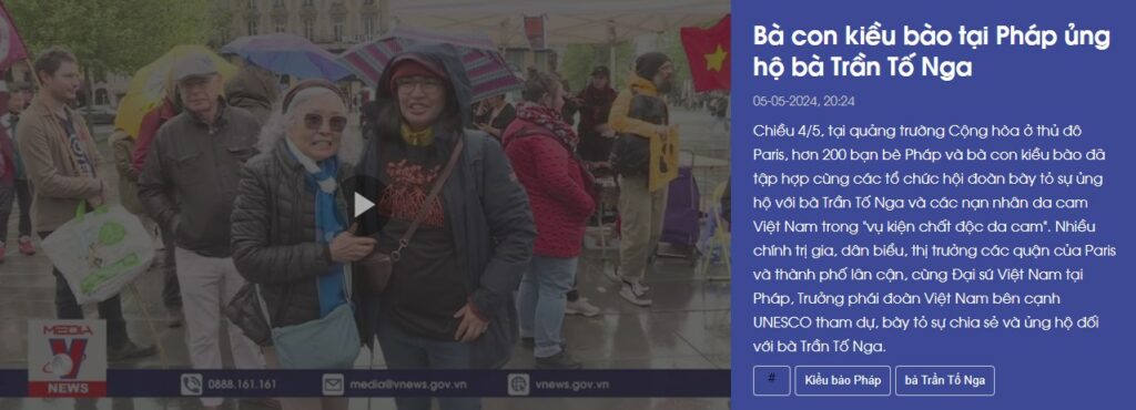 Theo lời kêu gọi của Ủy ban hỗ trợ Trần Tố Nga, hàng ngàn người Việt Nam và Pháp đã tập trung tại quảng trường République để ủng hộ các nạn nhân chất độc da cam trước ngày xét xử của Tòa án Paris (7/5/2024) về kháng cáo của bà Trần Tố Nga kiện14 công ty Mỹ chịu trách nhiệm sản xuất chất dioxine đổ xuống rừng và người dân trong Chiến tranh Việt Nam.