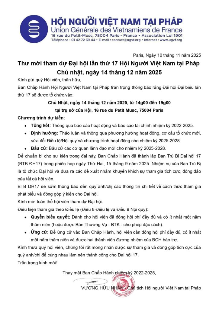 Thư mời tham dự Đại hội lần thứ 17 Hội Người Việt Nam tại Pháp Chủ Nhật, ngày 14 tháng 12 năm 2025, tại trụ sở của Hội, 16 rue du Petit Musc, 75004 Paris 11 Tháng mười một 2025 15 h 34 min00 260Views SHARE