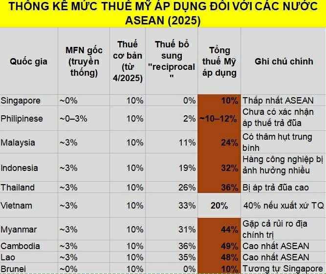 Ghi chú : Các mức thuế này là một phần của chính sách thuế quan “đối ứng” của chính quyền Tổng thống Trump và có thể thay đổi dựa trên các cuộc đàm phán song phương và diễn biến kinh tế – chính trị. Ngoài các mức thuế “đối ứng” cụ thể, Hoa Kỳ cũng đã áp dụng một mức thuế cơ bản 10% đối với hầu hết hàng nhập khẩu từ các quốc gia, và các mức thuế đối ứng cao hơn sẽ được áp dụng bổ sung nếu có.
